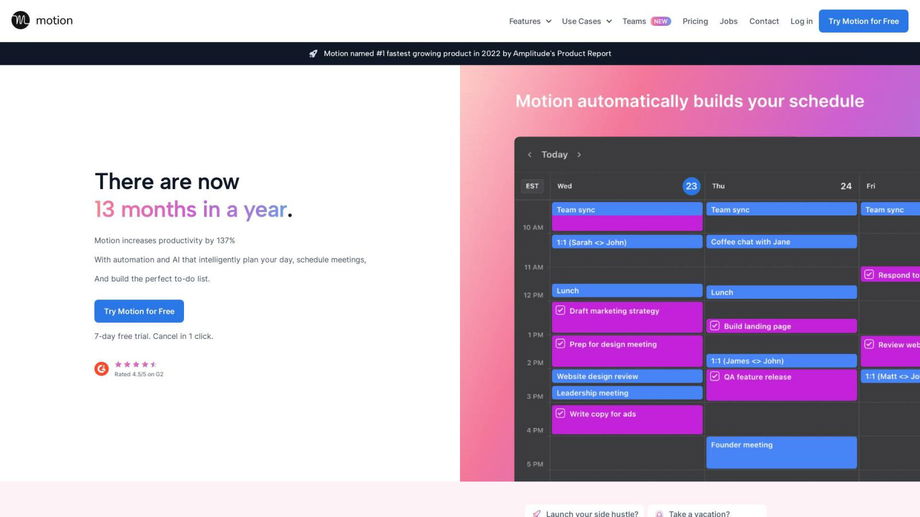 Motion is an AI-powered productivity tool that intelligently plans your day, schedules meetings, and builds the perfect to-do list to increase your productivity by 137%.