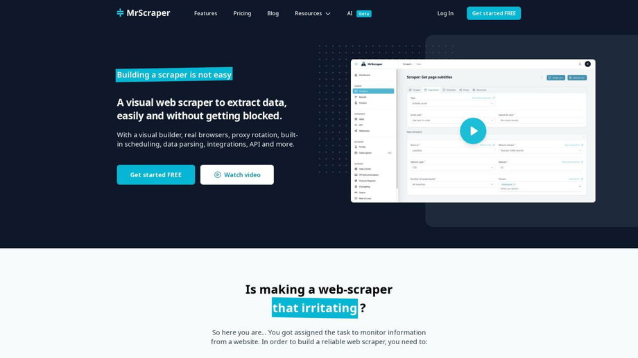 Mr Scraper is a visual web scraper that extracts data easily and without being blocked. Extract data, schedule scrapings, parse and clean data, and more.